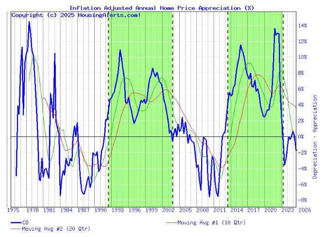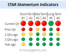 The indicators for the current quarter (top row) suggest that the short-term through long-term indicate a weak seller’s market for Colorado. A year ago, all the momentum indicators except for Short-Term #1 were green. (These graphs are from HousingAlerts.com. This is just a quick snapshot of what HousingAlerts.com has to offer. Go to my home page to get a free version for your state.)