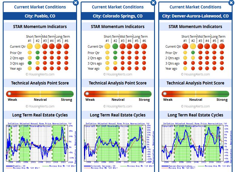 The market for Colorado Springs, Pueblo, and Denver is a little weaker than it was in December 2024, and it has returned to a depreciating market. All three STAR momentum indicators look virtually identical being red, with the #2 market indicator being the lone short-term indicator showing green. All of the mid-term and long-term indicators are currently red and have been for the last year or so. Colorado Springs is the only area showing green, indicating for that short-term indicator that Colorado Springs continues doing pretty well. The Technical Analysis Point Score (TAPS) graphs showing all these areas are solidly weak.